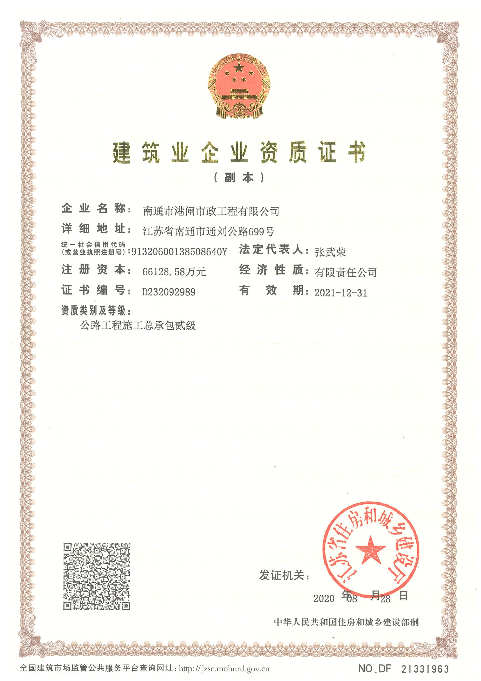 建筑業(yè)企業(yè)資質(zhì)證書(市政公用工程壹級(jí))